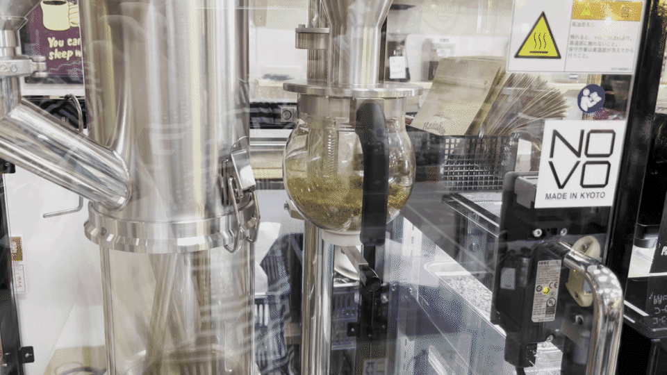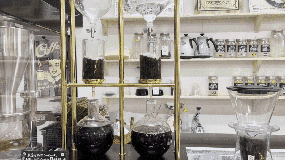 店内では店員さんがじっくり時間をかけて抽出したドリップ珈琲を楽しめます。基本的には温かい珈琲の提供みたいですが、” 水だし珈琲 ”もあります。水だし珈琲の抽出器はサイフォンを彷彿させるような、非常にインパクトのある見た目をしていました。水を入れた容器と珈琲粉を入れた容器の間にはコックがついており、水の流量を調整することでじっくり時間をかけて抽出しています(お店で使用している抽出器は、セットした水が落ちきるまでには8時間程度かかるみたいです)。