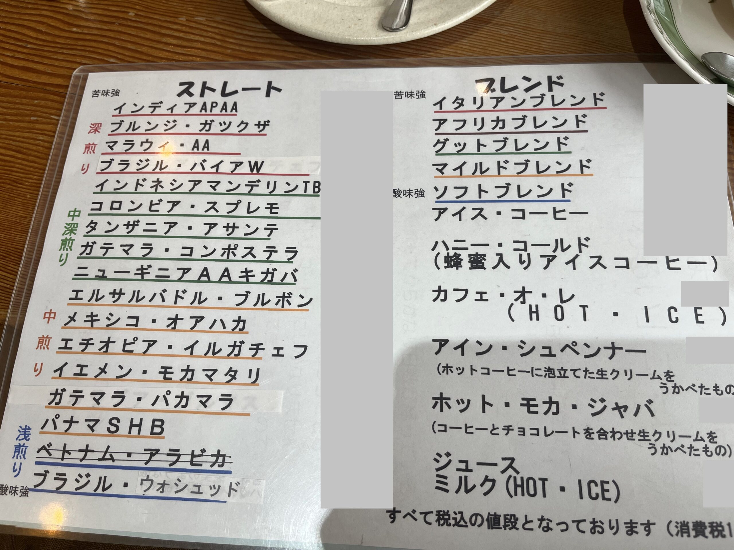 こちらのお店で提供されている珈琲は全て自家焙煎です。お店に入って目の前にスタッフさんの作業室がありましたので、そちらで珈琲豆を焼いているのでしょうか??焙煎具合は” 浅煎り “” 中煎り “” 中深煎り “” 深煎り “の4種類に分けられており、豆種によってそれぞれ特徴を活かした焙煎具合になっております。豆種もシングルだけで十数種類( 来店時は15種類でした。)の取り扱いがあります。他はブレンド種は6種類、ハニー・コールドやアイン・シュペンナーなど甘い珈琲を提供しております。