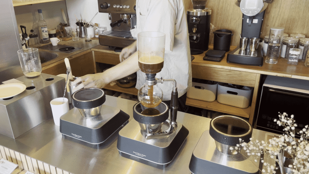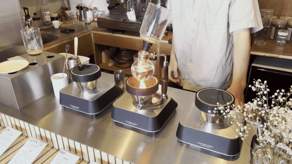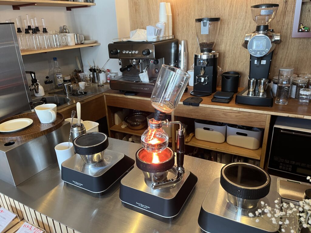 ホームページのトップ画面にも大々的に出てくるのですが、珈琲道具” サイフォン “が登場します。サイフォンはその独特な見た目から、珈琲の抽出道具だけでなくインテリアとしてもインパクトがあります。私も一時サイフォンにチャレンジしてみようと購入を検討したことがありますが、ろ過フィルターの管理やフラスコの洗浄などの衛生的な管理が難しいことや、苦みや酸味などの味に関わる成分のコントロールが難しい(気がする)ため断念しました。
