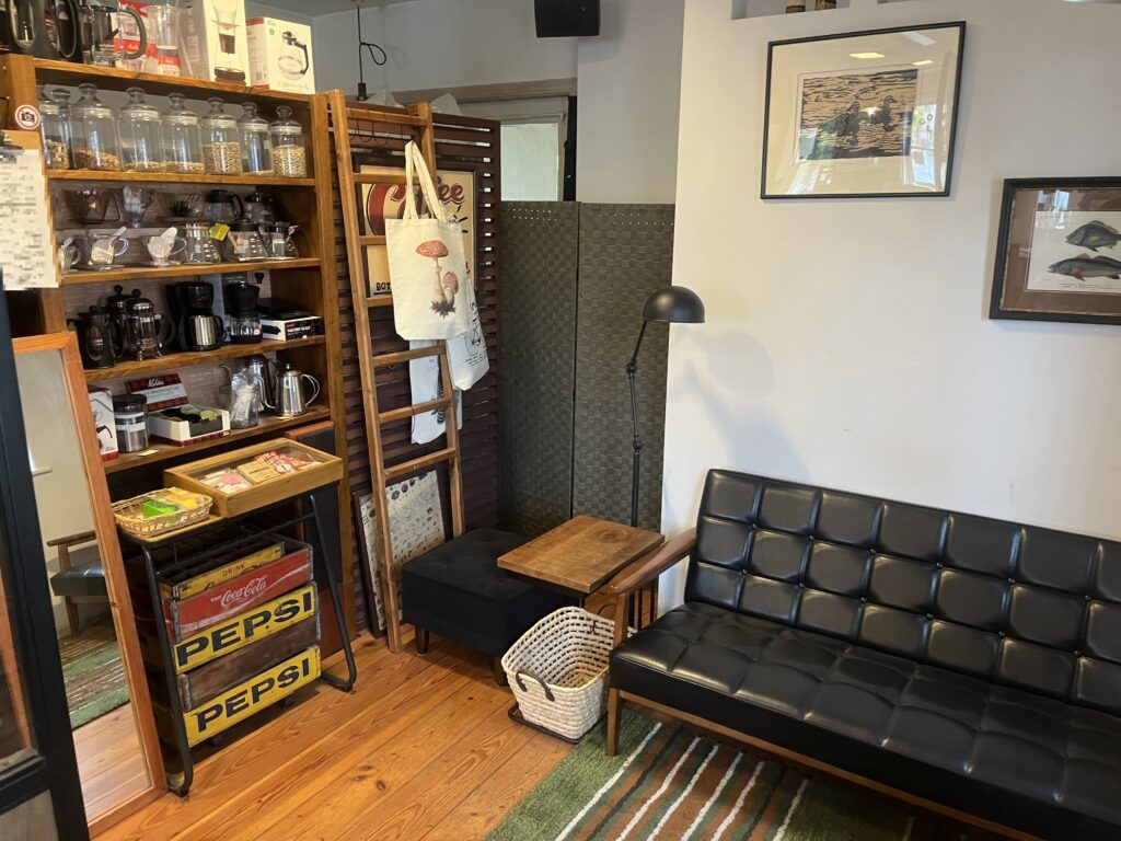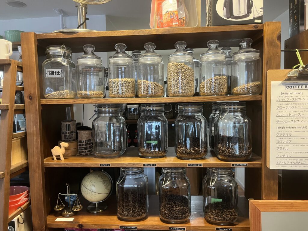 生豆、焙煎済みの豆が棚に並んでいます。こちらのお店は” 中煎り “が多いみたいですね。