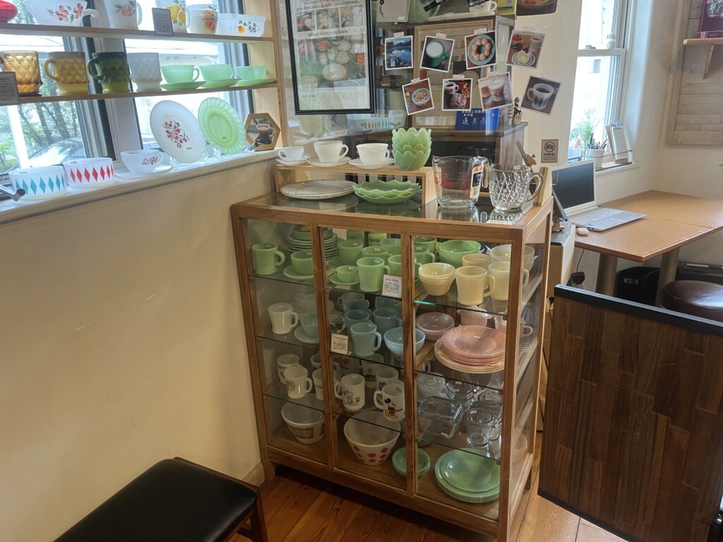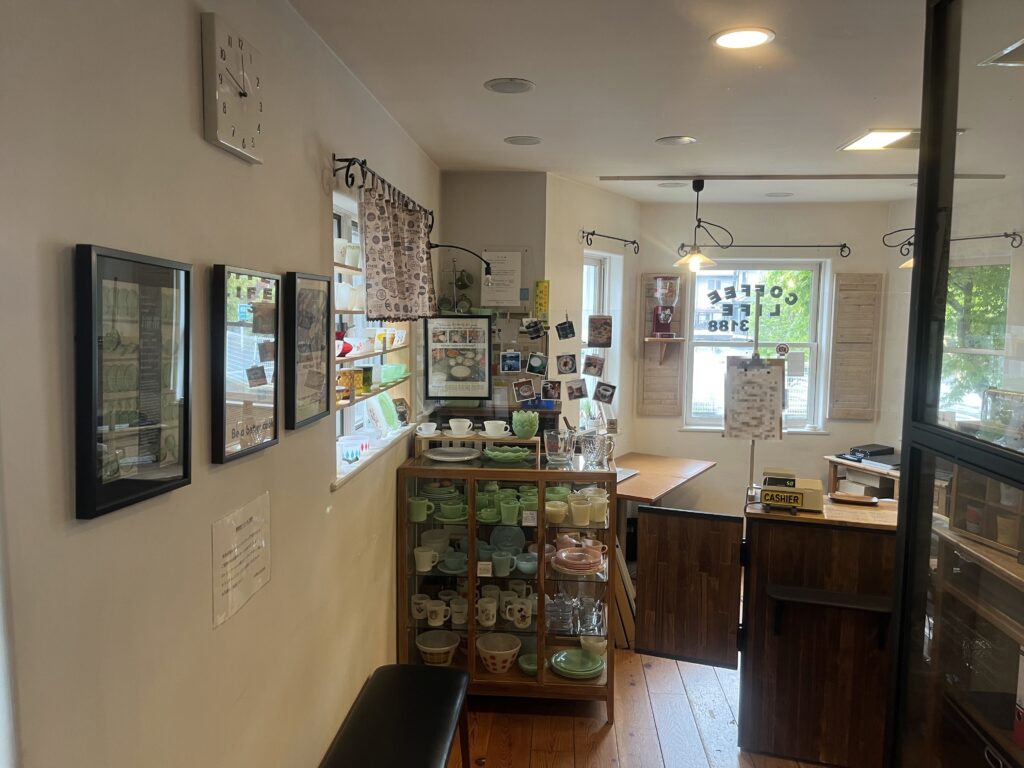 窓際にもずらりと並んでいます。コップに関しての知識がゼロなので、有名なものかはこの場でお伝えすることが難しいですが、半透明なコップで珈琲を入れると、とても映えそうです。