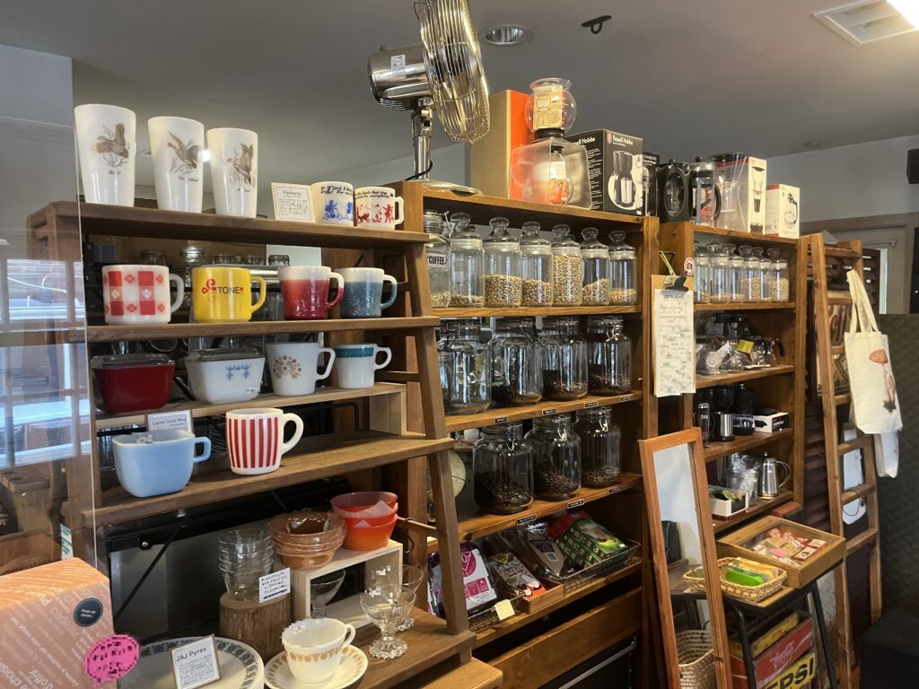珈琲豆の両隣にはドリッパーやサバー、コップなど珈琲を飲む際に必要な” 珈琲道具 “が所狭しと並んでいました。中でもコップがめちゃめちゃあります。