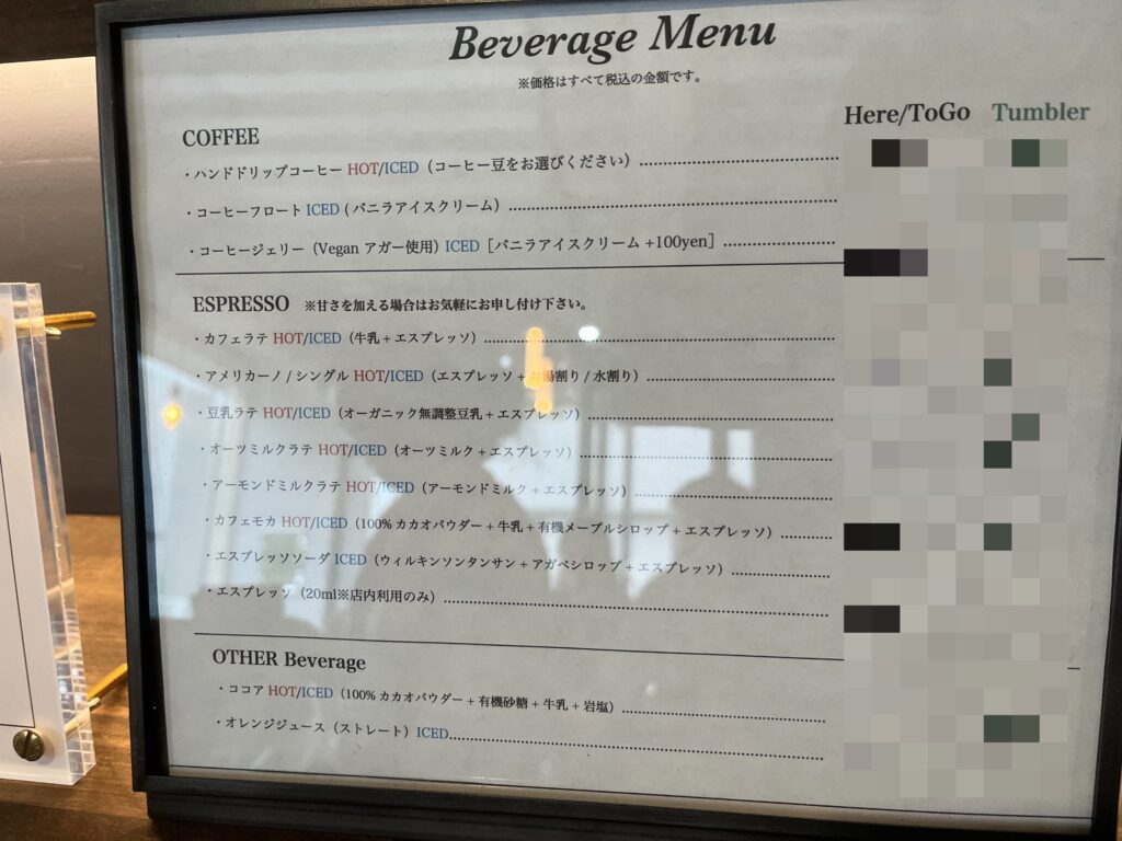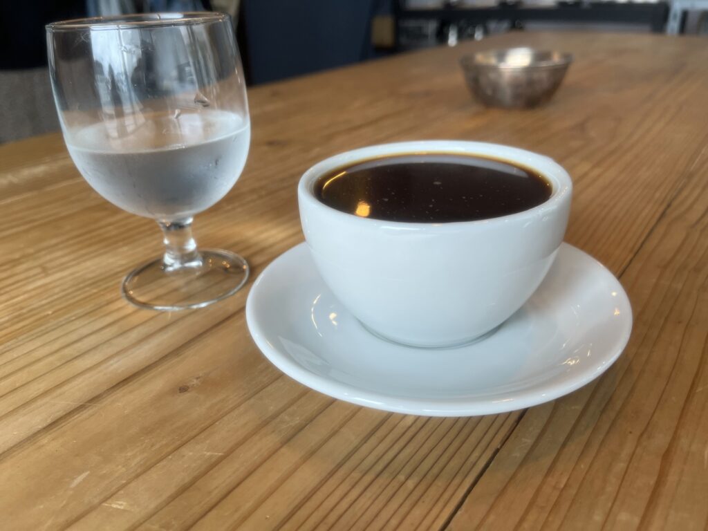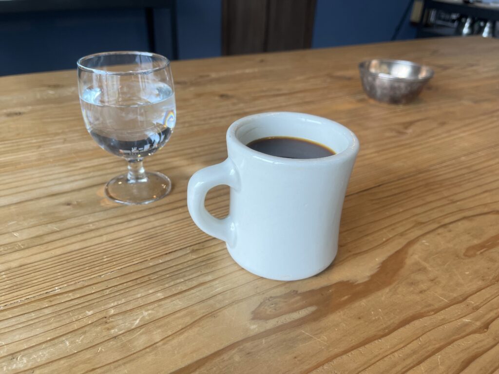 写真を見てお気づきの方もいるかも知れませんが、提供された珈琲は少し濁っていますね。こちらのお店では、ドリップコーヒーとして提供する珈琲には” 金属フィルター “を使用しているとのことです。金属フィルターはペーパーフィルターに比べると隙間が広いので、微粉が抽出後の珈琲側に流れて行ってしまい珈琲を飲み干す頃になるとザラっとした感覚が出てきてしまいます。金属フィルターの珈琲を飲みなれていない方は、少し注意が必要かもしれません。