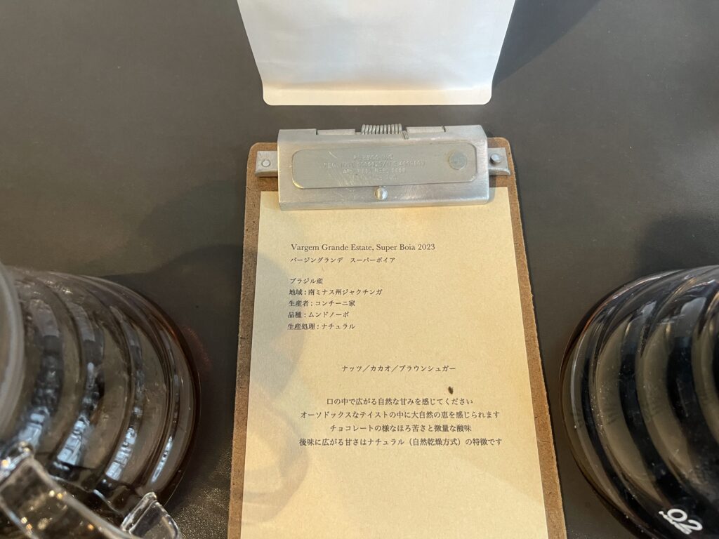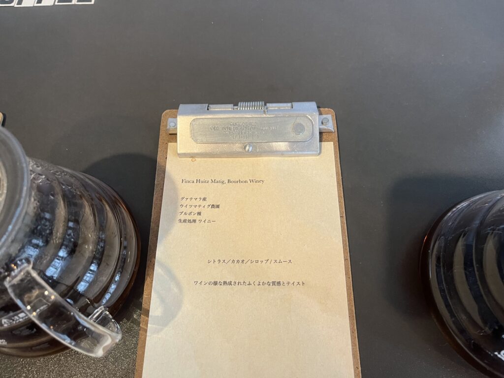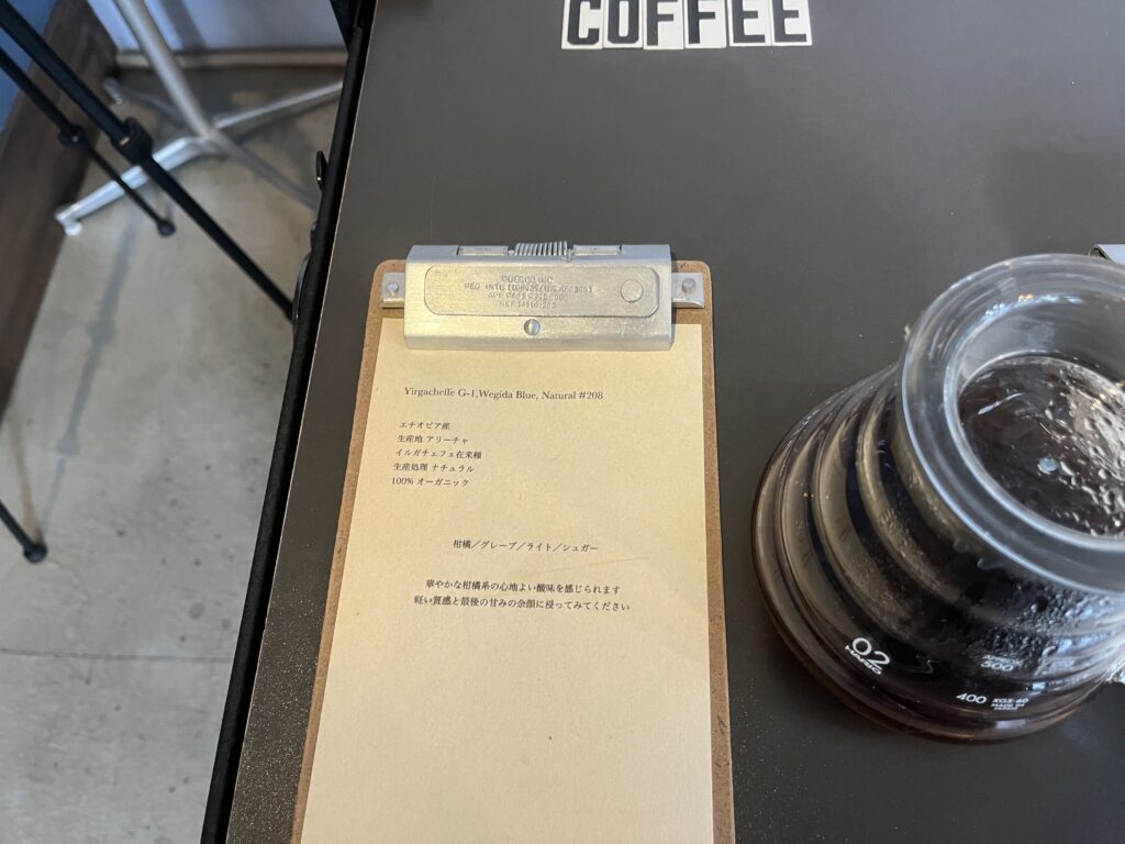 試飲テーブルにはドリップされた珈琲の隣にそれぞれのデータシートが置かれておりますので、自分の好みに合った銘柄を注文の前に確認が出来ます。珈琲は本当に多種多様なので、事前にデータを提示していただけるお店は個人的にはとても良心的だと思っています。